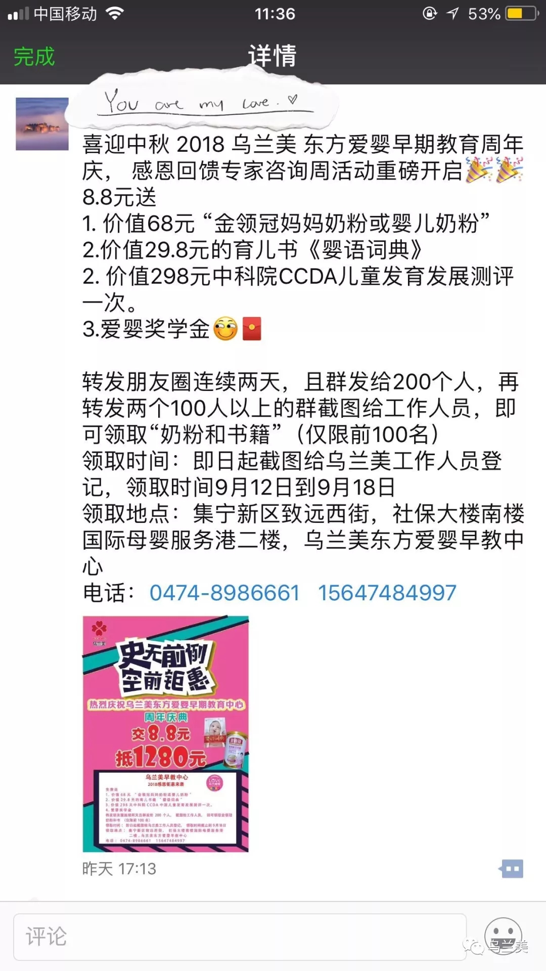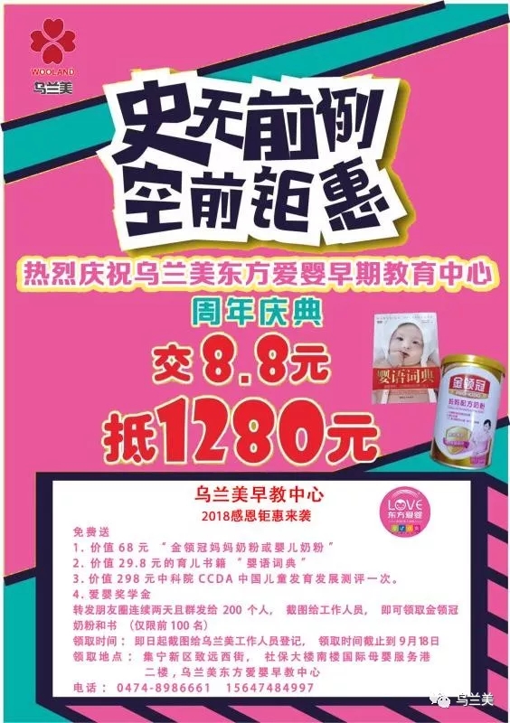 領(lǐng)取時(shí)間:即日起截圖給烏蘭美•東方愛(ài)嬰早教中心工作人員登記,領(lǐng)取時(shí)間截止到2018年9月19日。
