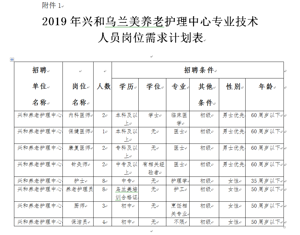 5.戶籍要求截止到2018年11月30日前為烏蘭察布市戶籍。(詳見(jiàn)附件1:2019年興和烏蘭美養(yǎng)老護(hù)理中心專業(yè)技術(shù)人員崗位需求計(jì)劃表)。