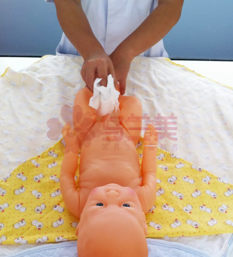第五步:脫紙尿褲:輕輕解開兩側(cè)腰貼,提起寶寶腳部,抓住紙尿褲向內(nèi)折疊取出。