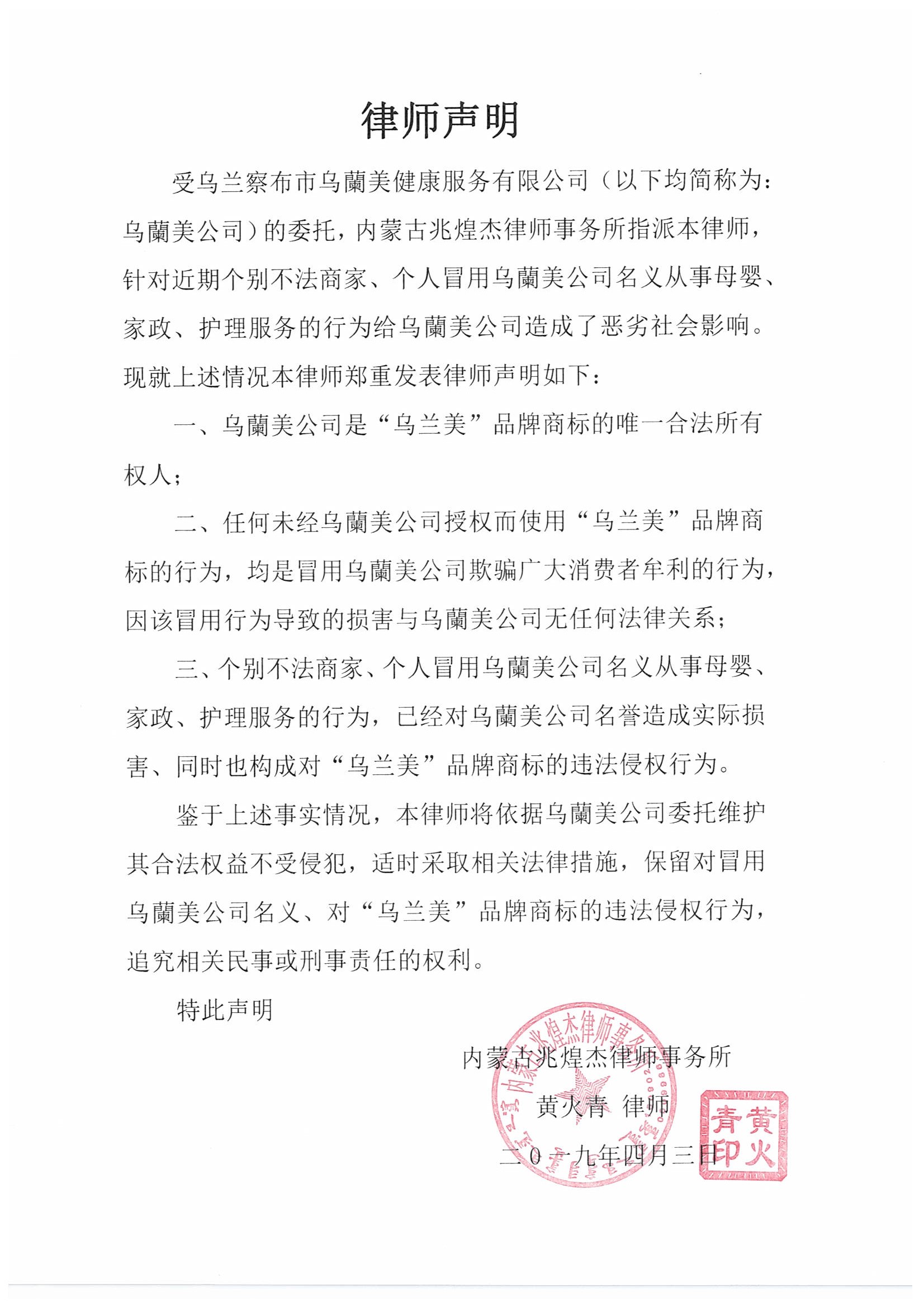 【律師聲明】關(guān)于近期出現(xiàn)冒用烏蘭美品牌的律師聲明發(fā)布時(shí)間: 2019-04-04 -